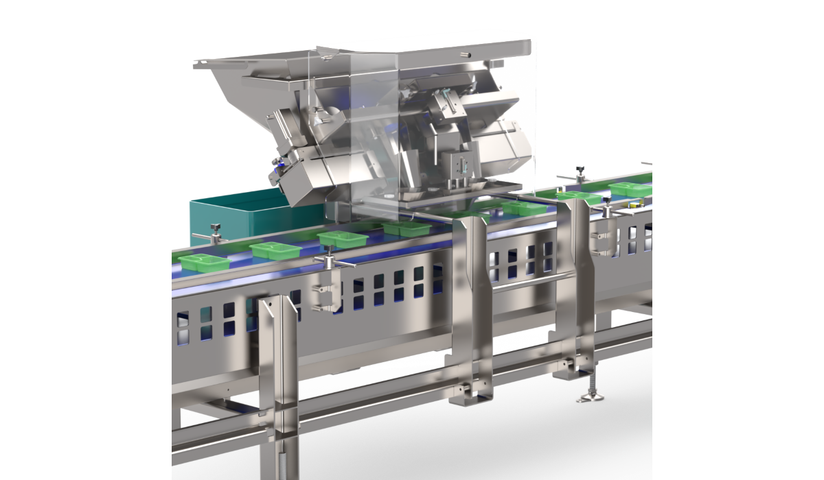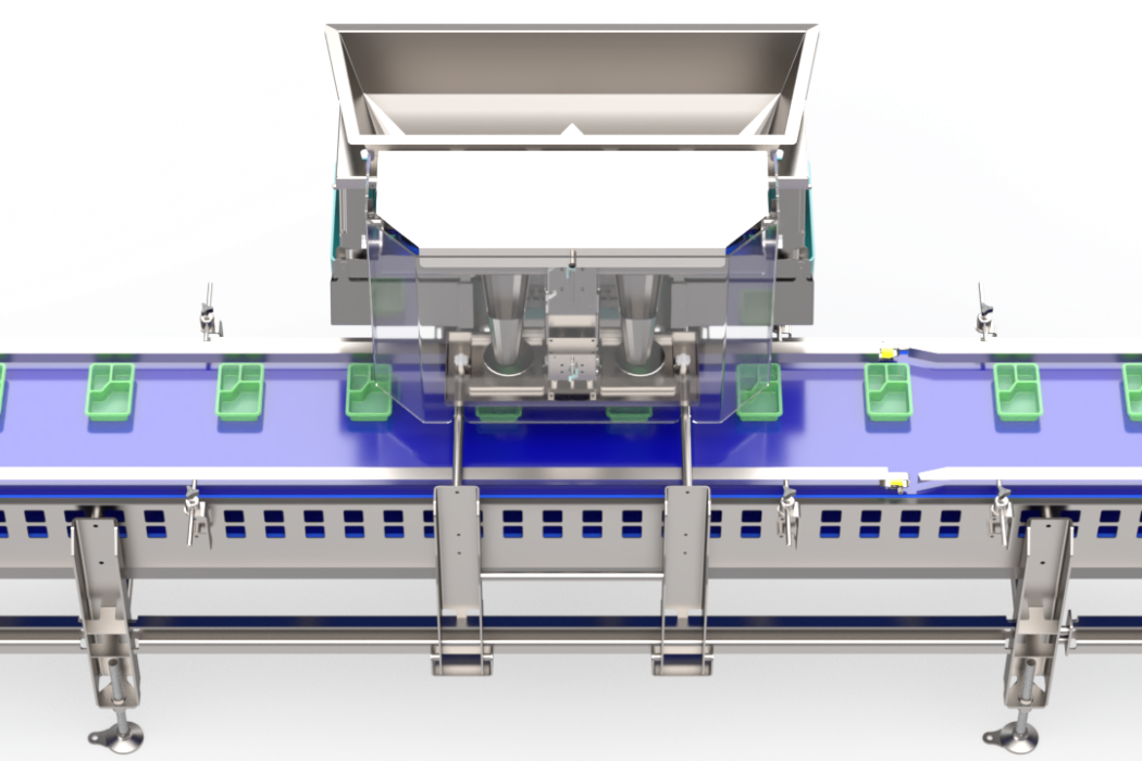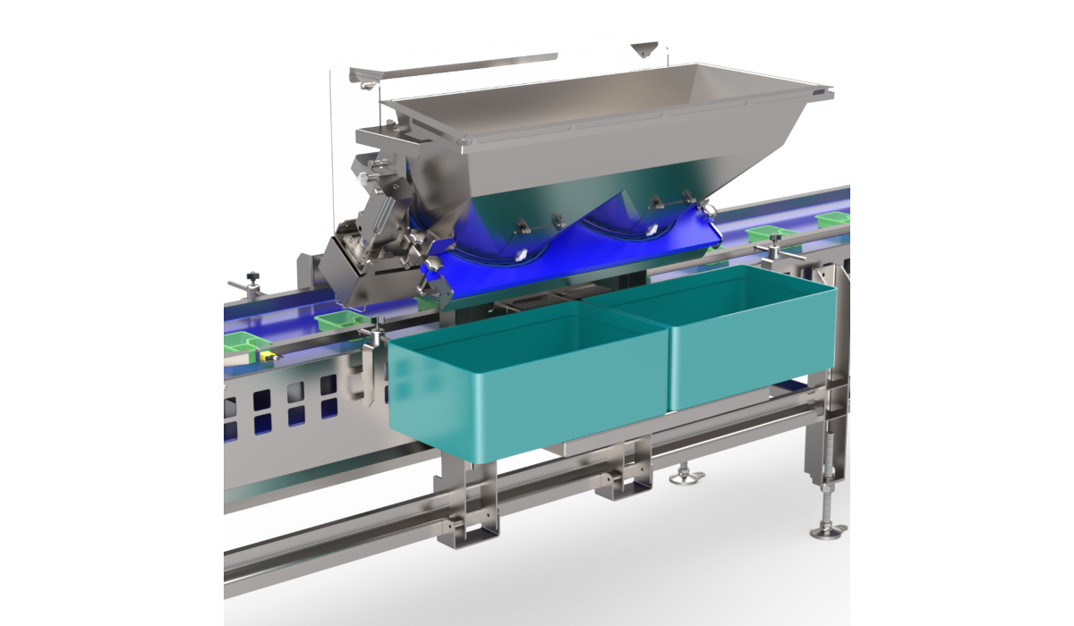 The Operation of the filler begins with the bulk product being dumped into the hopper and rotary volumetric disc. The disk rotates under the bulk product filling the pockets, there, product guides and wipers ensure the product pockets are full while indexing to the fill position where the product then drops to two containers at once. Machines can be ordered with a tooling /sanitation cart for easy access to changeover parts and easy sanitation of stored parts.