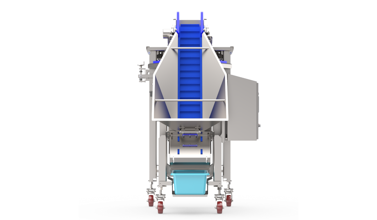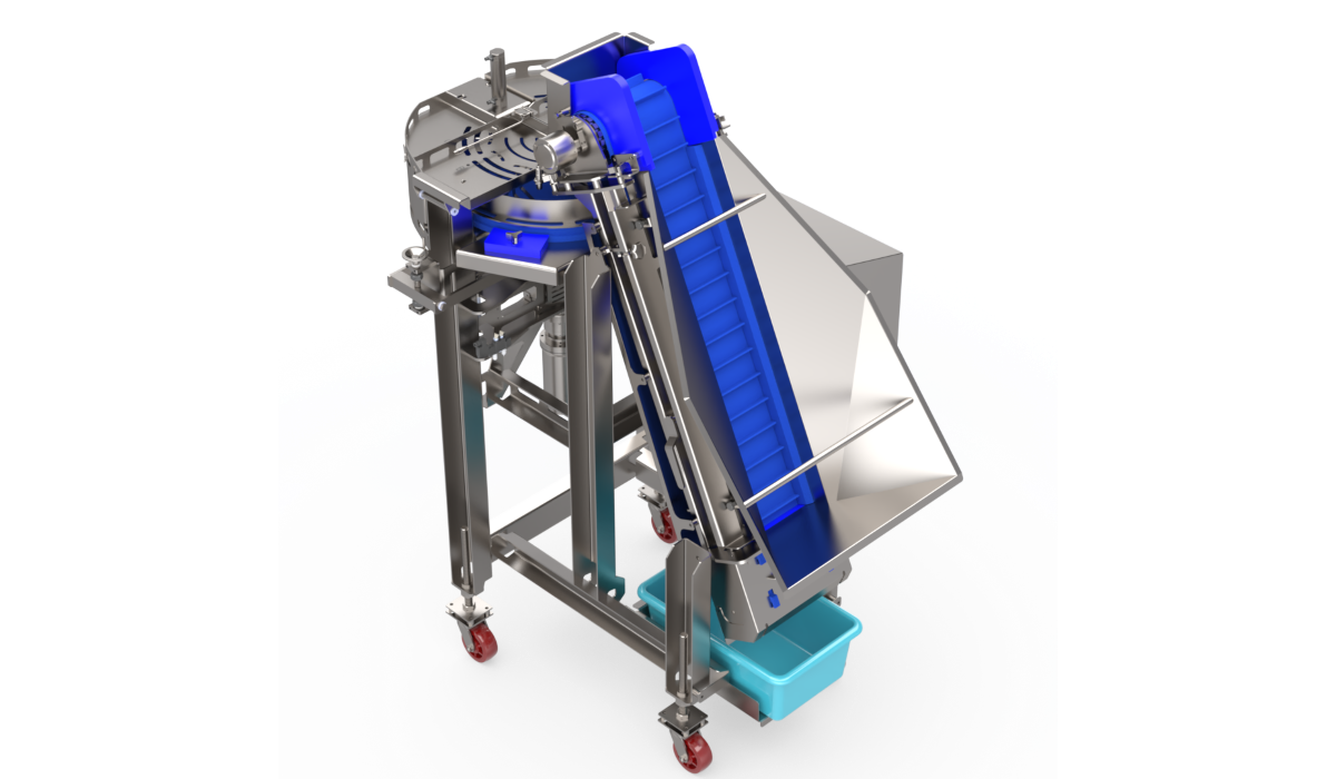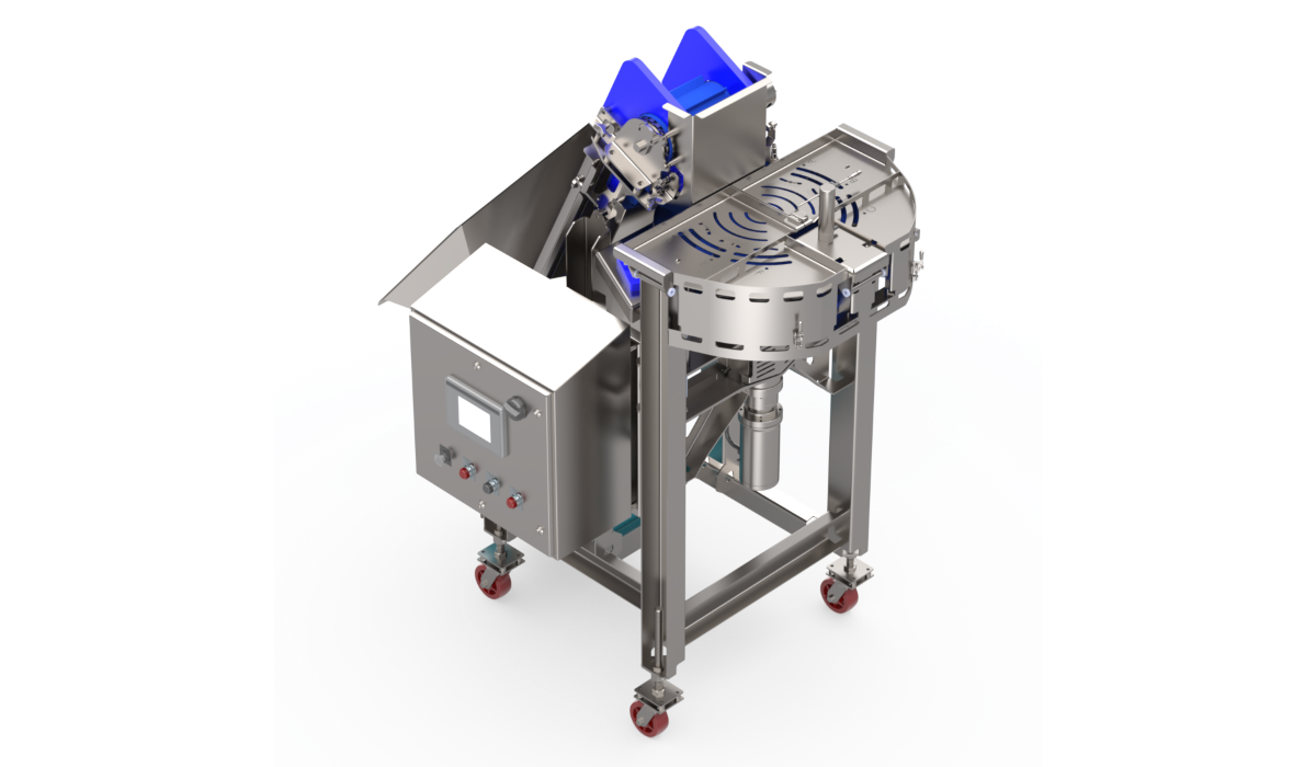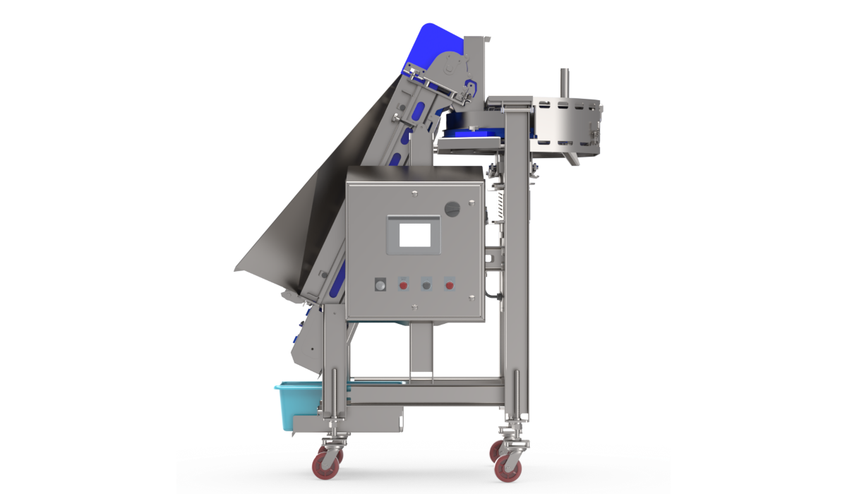 The Operation of the filler begins with the bulk product being dumped into the incline hopper, from there the product is conveyed up and metered into the rotary volumetric disc. To make sure the correct amount of product is being dispensed, there are multiple product guides and wipers that ensure the product pockets are full while indexing to the fill position. Machines can be ordered with a tooling /sanitation cart for easy access to changeover parts and easy sanitation of stored parts.